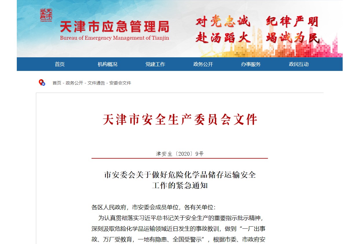 津安生〔2020〕9号市安委会关于做好危险化学品储存运输安全工作的紧急通知各区人民政府,市安委会成员单位,各有关单位: 为认真贯彻落实习近平总书记关于安全生产的重要指示批示精神,深刻汲取危险化学品运输领域近日发生的事故教训,做到“一厂出事故、万厂受教育,一地有隐患、全国受警示”,根据市委、市政府安排部署,现就切实做好我市危险化学品存储、运输相关领域安全生产工作通知如下:一、深刻汲取事故教训6月13日,浙江温岭发生液化石油...